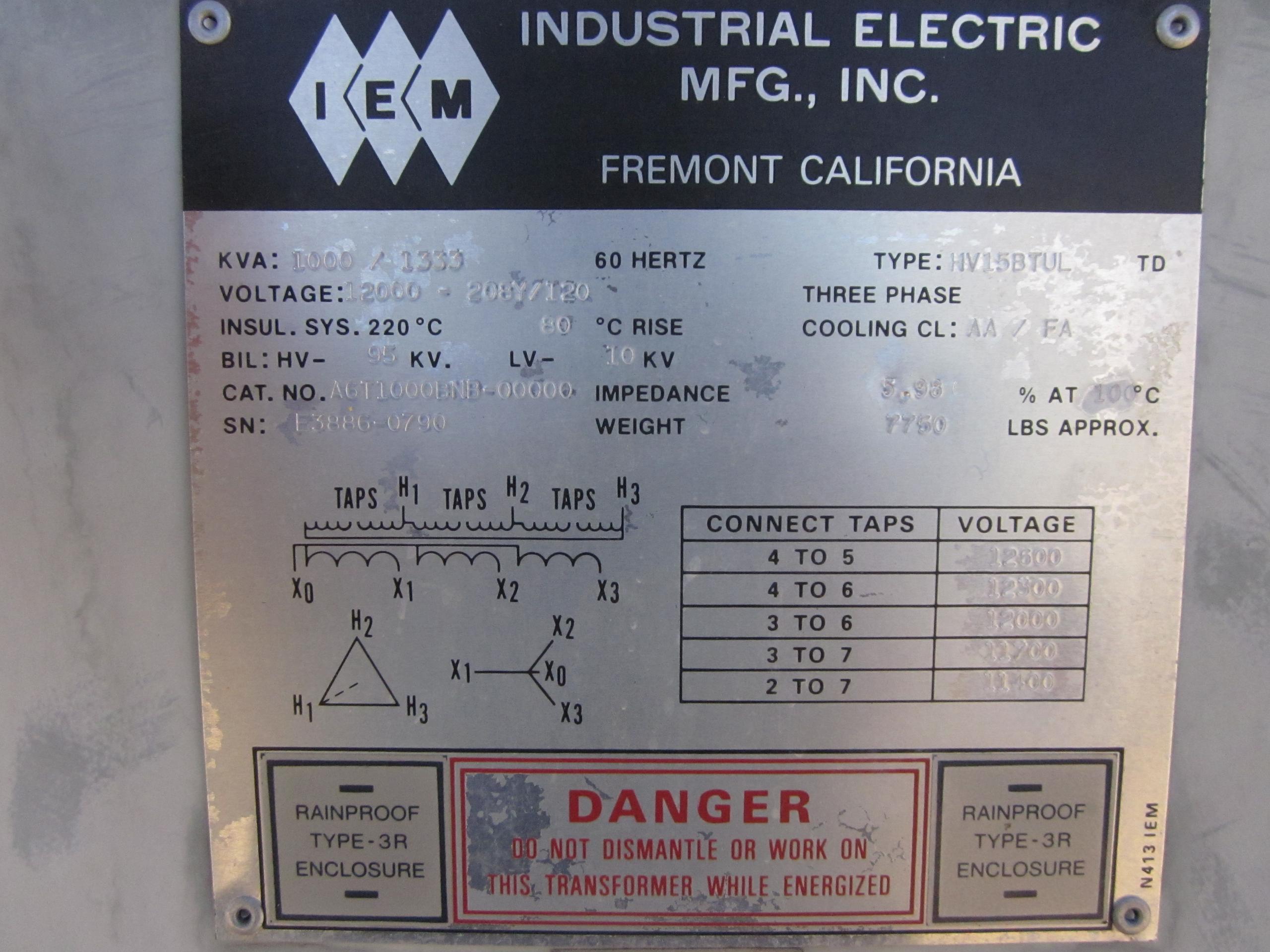 1000 KVA Industrial Electric Mfg Inc Substation Dry Transformer available as-is or remanufactured.